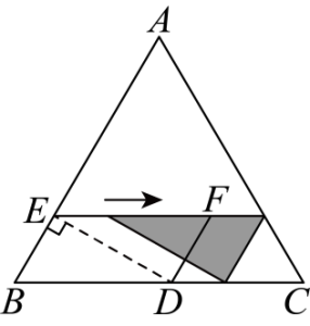 1.如图,等边三角形ABC的边长AB=9,点D在边BC上,且BD=5,过点D作DE垂直于AB,垂足为E,以BE、BD为邻边作平行四边形BEFD,将三角形EDF沿BC向右平移,使点F的对应点落在边AC上,则平移的距离为 .